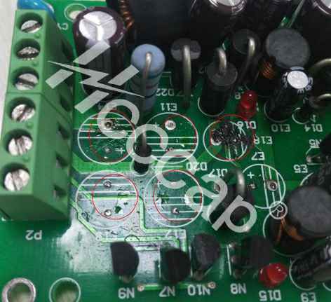 2. 高低电位间距较小的地方,电腐蚀强度更大,反应发生区域PCB走线腐蚀破坏或其他器件受影响失效,整版性能受损。【PCB损坏】